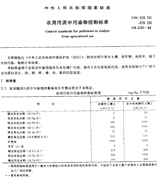 農用污泥中污染物控制標準GB 4284-84)