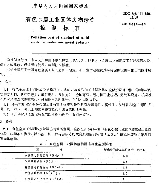 有色金屬工業(yè)固體廢棄物污染控制標(biāo)準(zhǔn)GB 5085-85