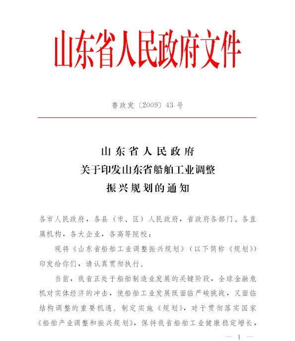 山東省船舶工業(yè)調(diào)整振興規(guī)劃 魯政發(fā)[2009]43號(hào)