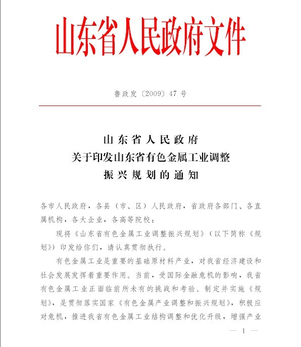 山東省有色金屬工業(yè)調(diào)整振興規(guī)劃 魯政發(fā)[2009]47號