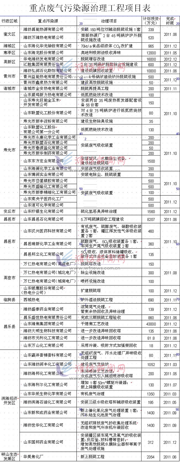今年我市要對16個重點片區的53處重點污染源進行治理。對每個重點污染源,都列出了治理重點和治理時限?膮^的濰坊昌能熱源有限公司,要安裝150噸位雙堿法脫硫設施一套,今年6月份完工。濰城區的山東;A龍硝銨有限公司,對70000噸/年食品級液體二氧化碳改擴建,今年年底完成。寒亭區山東海龍股份有限公司,將利用奧地利吸附法吸收異味,今年5月份完工。高新區華電濰坊發電有限公司將進行脫硫增容改建,匯勝集團有限責任公司新上兩臺35噸位鍋爐脫硫除塵設施,今年年底完成。另外,青州、諸城、壽光、安丘、昌邑、高密、臨朐、昌樂、濱海經濟開發區、峽山生態發展區等都有重點污染源治理項目。